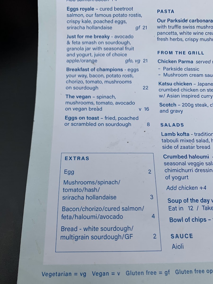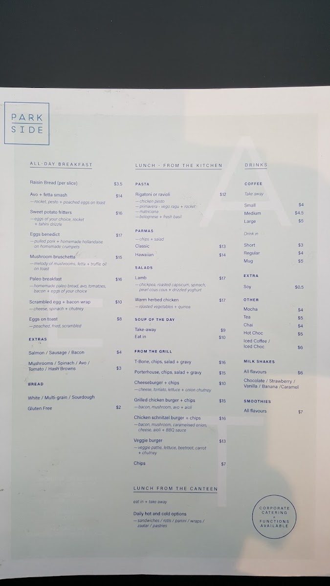 Welcome to Parkside, an inviting cafe located at 369 Royal Parade, Parkville, where culinary passion meets excellent service. Renowned for its all-day breakfast offerings, the menu is a delightful mix of classic and contemporary dishes, featuring favorites like Avocado and Fetta Smash, Eggs Benedict, and Sweet Potato Fritters.